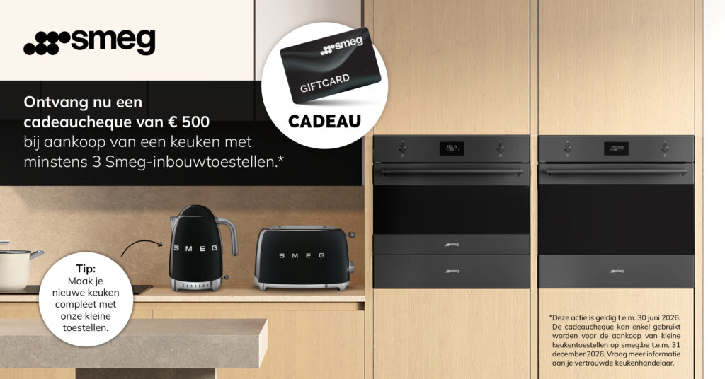 Bij aankoop van een keuken met minstens 3 SMEG-toestellen ontvang je een SMEG-cadeaubon ter waarde van 500 euro om je keuken verder aan te vullen met kleine SMEG-keukentoestellen.